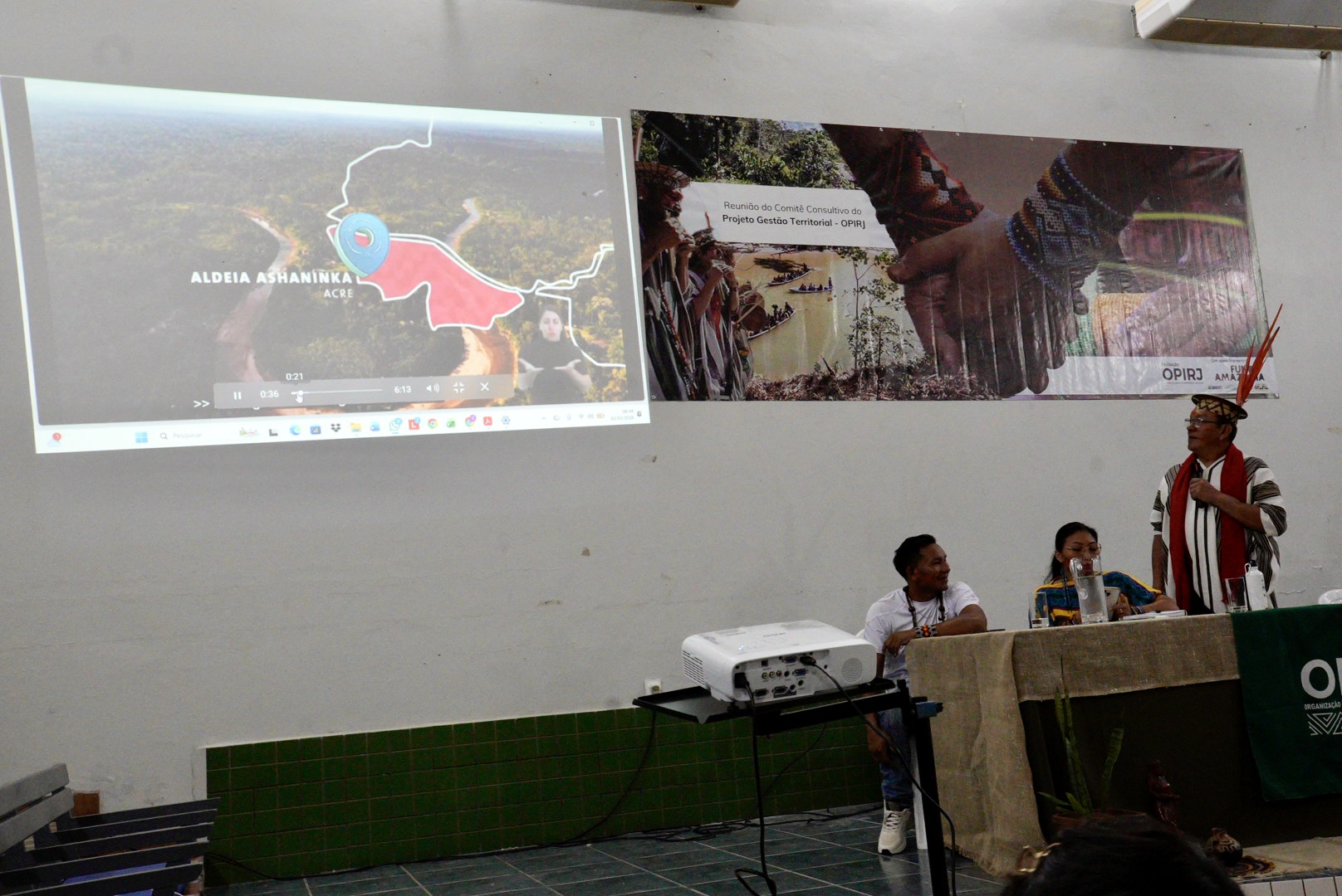 A mesa de abertura foi mediada por Luiz Nukini (tesoureiro da OPIRJ) e contou com a participação de Eliane Yawanawa (secretária da OPIRJ), Francisco Piyãko (coordenador da OPIRJ), Petrônio Noke Ko’î (2º tesoureiro da OPIRJ), Isaac Piyãko (coordenador do DSEI Alto Juruá), Auricélio (presidente do CONDISI/DSEI Alto Juruá) e Nedina Yawanawa (diretora na Secretaria de Povos Indígenas do Estado do Acre).